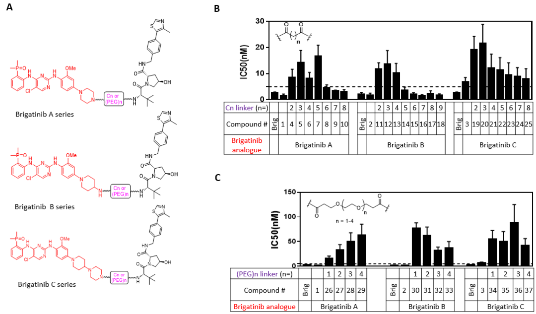 项目团队通过研究PROTAC降解剂内部三部分的构效关系(Brigatinib类似物、linker结构、VHL-1),细胞增殖抑制活性和对ALK蛋白的降解活性筛选出基于Brigatinib的ALK降解剂SIAIS117 (图2)。 该降解剂不仅可以有效降解含激活突变的ALK融合蛋白,而且对具有G1202R耐药突变的ALK融合蛋白也展示了良好的降解效果。ALK G1202R突变是目前临床治疗中较为常见但难以克服的耐药突变,该研究首次展示了蛋白降解剂可以对ALK耐药突变高度有效。