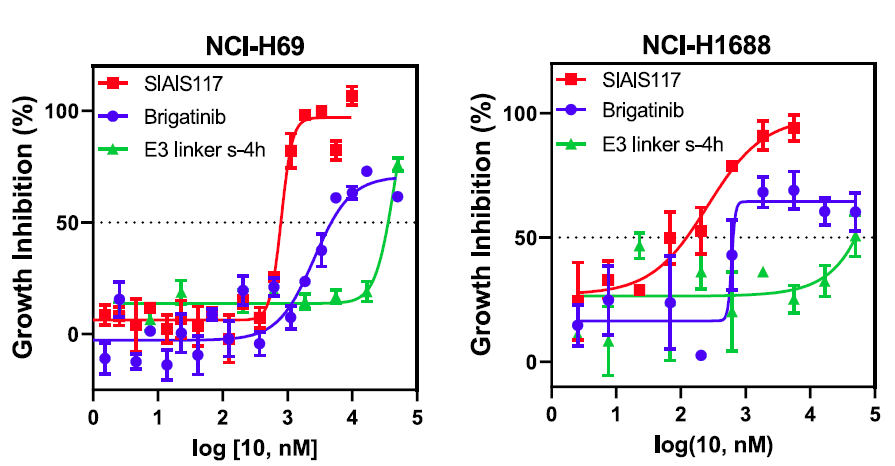 肿瘤耐药性通常有几类情况,如点突变、信号旁路激活、细胞形态转变等等。在肺癌中,对ALK靶向药物耐药的一种机制是由非小细胞肺癌NSCLC (Non small cell lungcancer) 向小细胞肺癌SCLC (small cell lung cancer) 的转化。目前,SCLC尚没有好的治疗手段。研究团队发现SIAIS117对小细胞肺癌细胞系NCI-H69和NCI-H1688有一定的增殖抑制作用。相对于原药Brigatinib而言, SIAIS117如何对SCLC细胞系起到作用,仍然需要更多的研究。该报道首次说明蛋白降解剂除了可以通过降解靶蛋白造成对细胞的杀伤之外,还可以一种新的方式来克服肿瘤耐药。