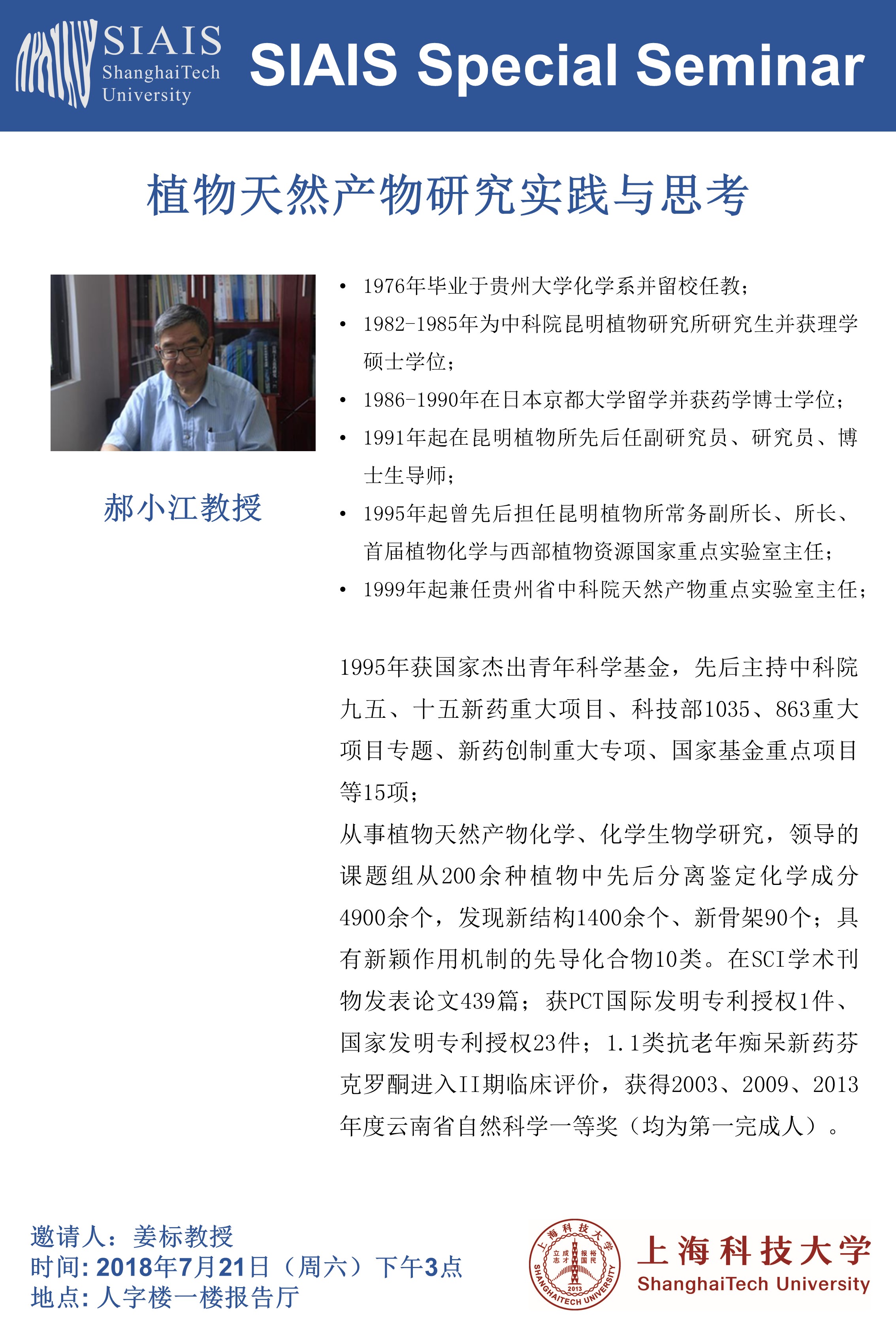 SIAIS Special Seminar by professor Xiaojiang HAO: 植物天然产物研究实践与思考