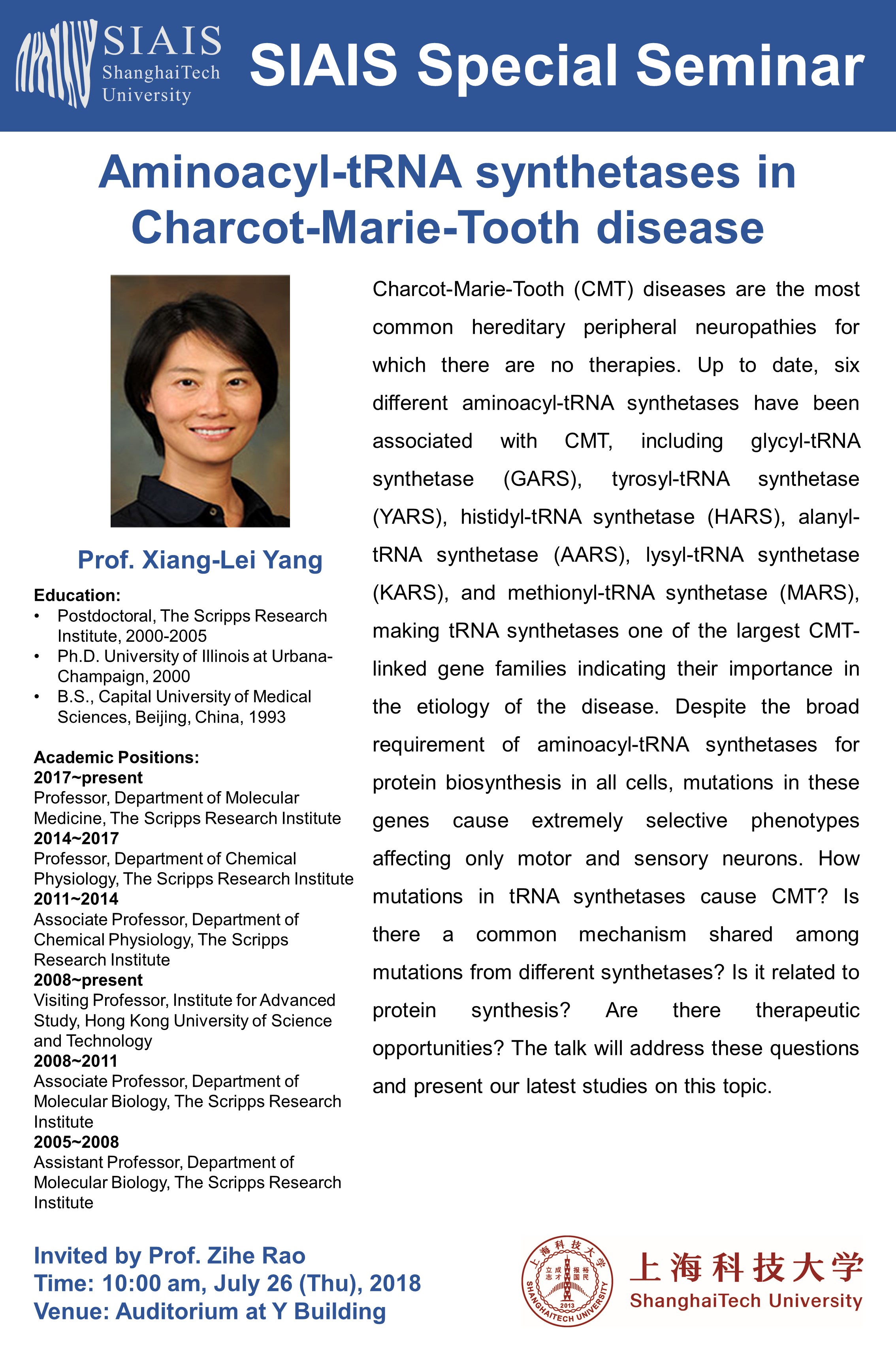 SIAIS Special Seminar by Dr. Xiang-Lei Yang: AminoacyI-tRNA synthetases in Charcot-Marie-Tooth Neuropathy