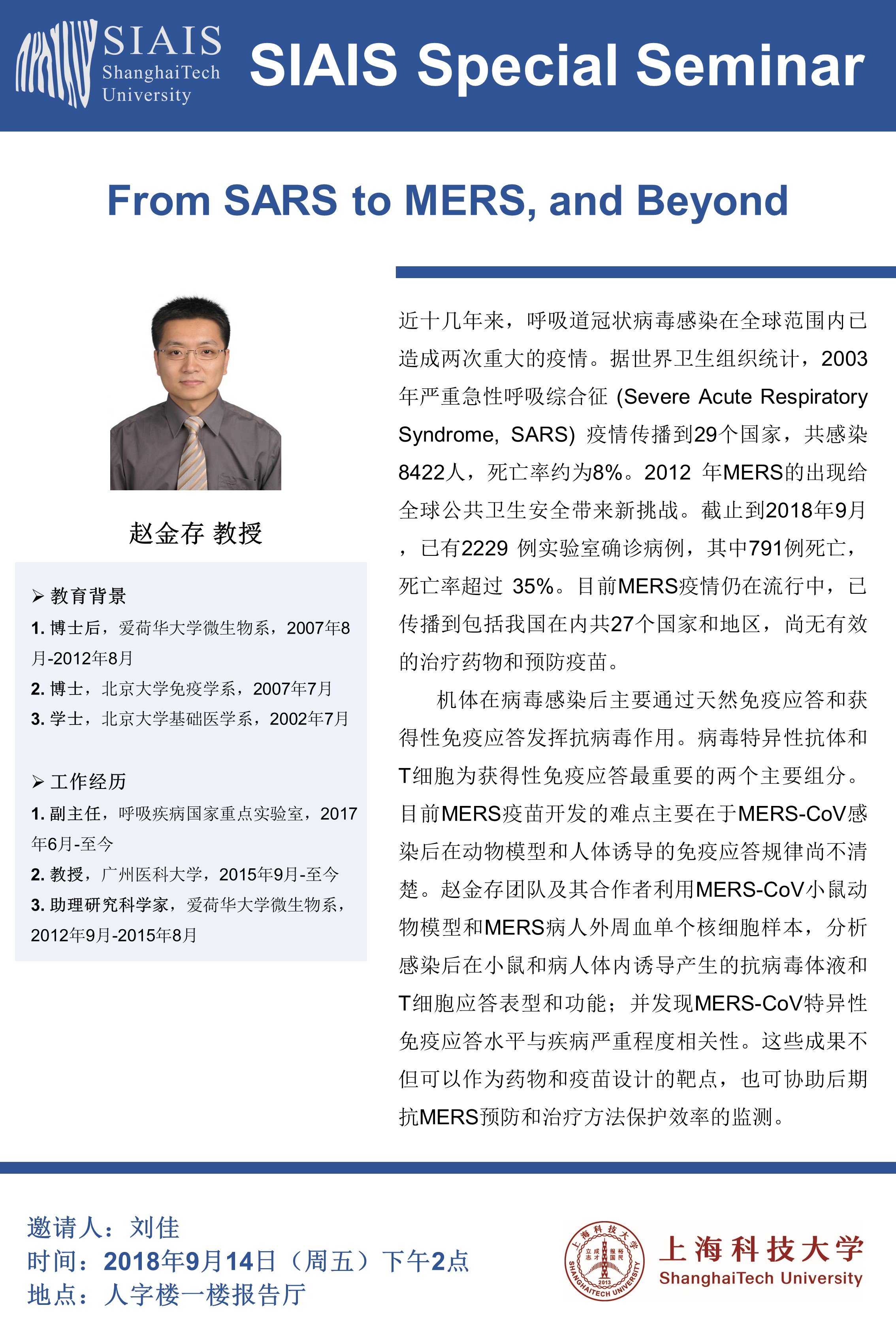 SIAIS Special Seminar by Prof. Jincun Zhao: From SARS to MERS, and Beyond
