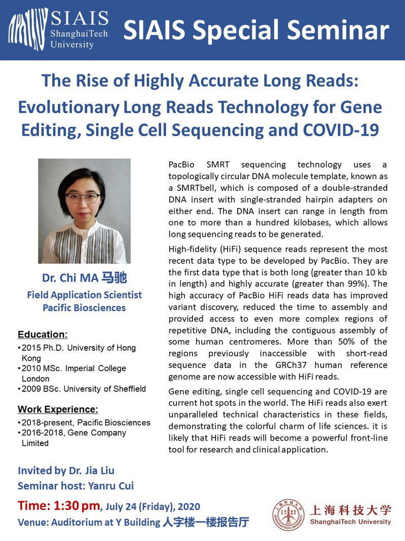 SIAIS Special Seminar| ​The Rise of Highly Accurate Long Reads: Evolutionary Long Reads Technology for Gene Editing, Single Cell Sequencing and COVID-19