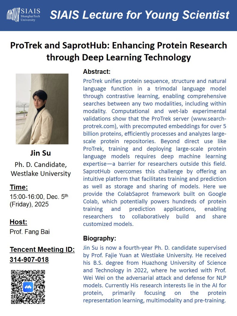 Jin Su is now a fourth-year Ph. D. candidate supervised by Prof. Fajie Yuan at Westlake University. He received his B.S. degree from Huazhong University of Science and Technology in 2022, where he worked with Prof. Wei Wei on the adversarial attack and defense for NLP models. Currently His research interests lie in the AI for protein, primarily focusing on the protein representation learning, multimodality and pre-training.