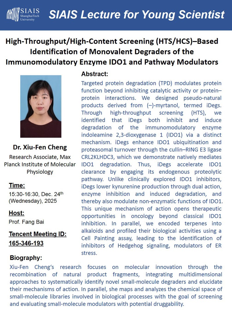 Xiu-Fen Cheng‘s research focuses on molecular innovation through the recombination of natural product fragments, integrating multidimensional approaches to systematically identify novel small-molecule degraders and elucidate their mechanisms of action. In parallel, she maps and analyzes the chemical space of small-molecule libraries involved in biological processes with the goal of screening and evaluating small-molecule modulators with potential druggability.