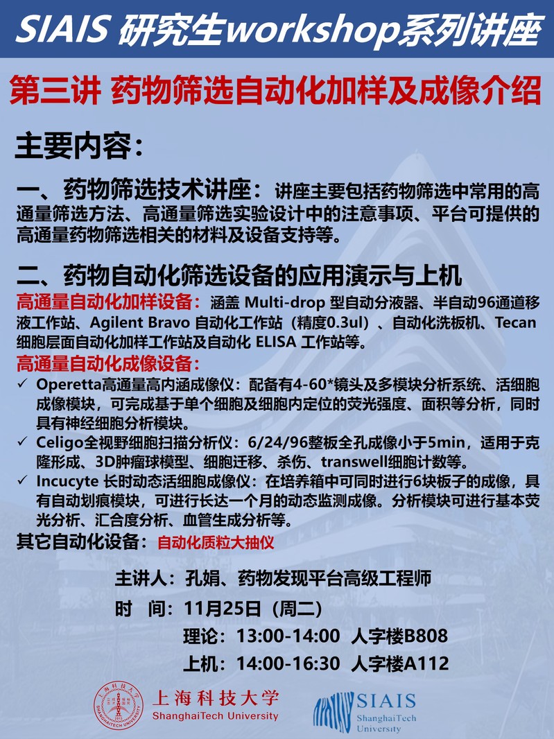 91直播下载 将于11月25日(周二、13:00)在人字楼B808举行SIAIS研究生workshop系列讲座,第三讲《药物筛选自动化加样及成像介绍》。