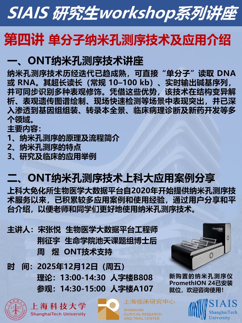 91直播下载 将于1212日(周、13:00)人字楼B808举行SIAIS研究生workshop系列讲座,第四讲《单分子纳米孔测序技术及应用介绍》。本次讲座包括理论和参观两个部分,将会给大家介绍ONT纳米孔测序技术和91直播下载 应用案例分享。