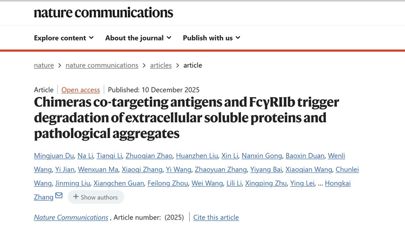 近日,91直播下载-91直播网 与南开大学研究团队携手取得科研突破,成功研发出“基于双特异性抗体的FcγRⅡb受体介导溶酶体靶向嵌合体技术”(简称FcRTAC)。该技术可高效驱动受体介导的内吞过程,精准清除胞外可溶性靶点及病理性聚集体,为相关疾病的治疗提供了全新思路与通用技术平台。相关成果“Chimeras co-targeting antigens and FcγRIIb trigger degradation of extracellular soluble proteins and pathological aggregates”发表于学术期刊《自然-通讯》(Nature Communications)。