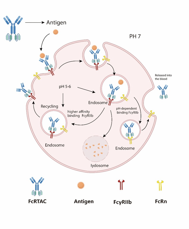 基于双特异性抗体的FcRTAC平台具备突出的模块化特性,为其工程化开发奠定了基础。例如可将平台中的抗原靶向抗体部分设计为pH敏感型:在生理pH环境下,该抗体能与靶抗原稳定结合;进入酸性环境后,抗体则与抗原解离,使内体中的抗原可顺利转运至溶酶体完成降解。