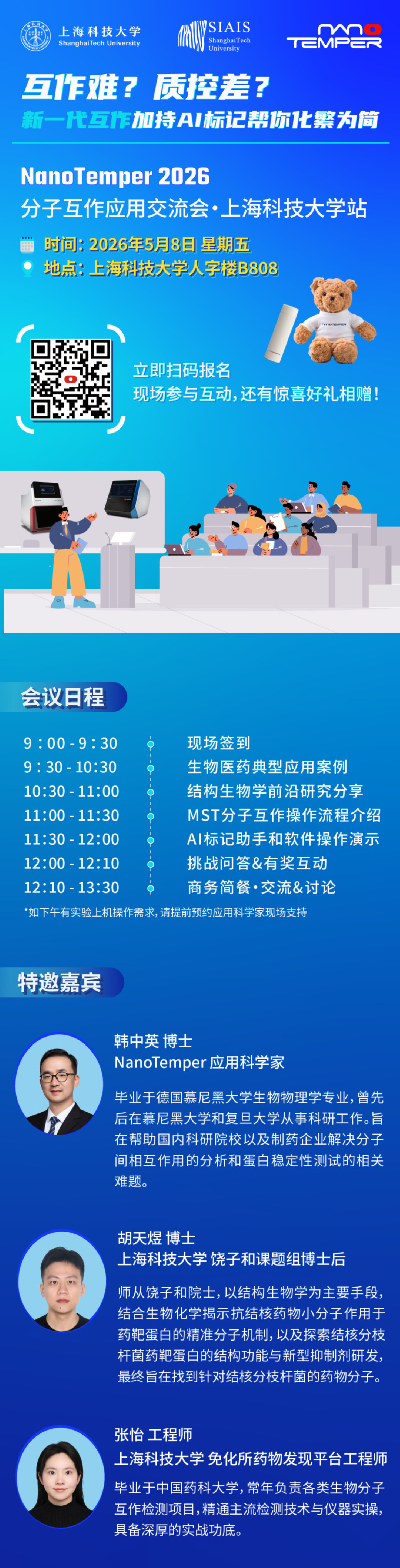 本次分子互作交流会走进上海科技大学,带您领略 NanoTemper 全新 AI 智能标记助手 与 新一代“光热混动”(MST&SpS)分子互作模式的强强联手。我们不只谈理论,更关注如何在生命科学、药学、临床医学和结构生物学等重要领域,将 AI 融入工作流,让数据流程完美适配未来研究。